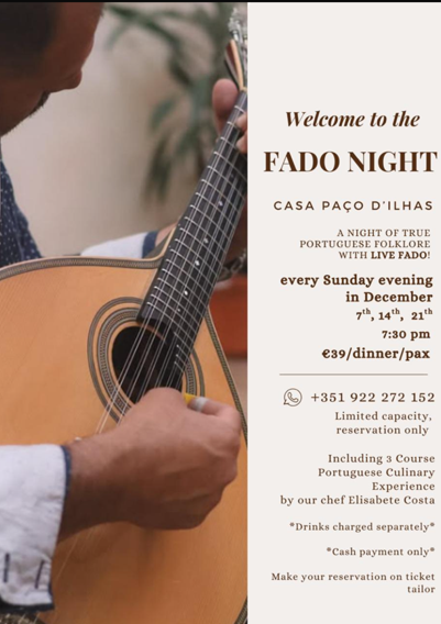 We will take you on a journey filled with traditional Portuguese Fado Music with artists from the heart of Fado: Alfama and Mouraria in Lisboa - as well as a culinary adventure provided by the talented Elisabete Costa