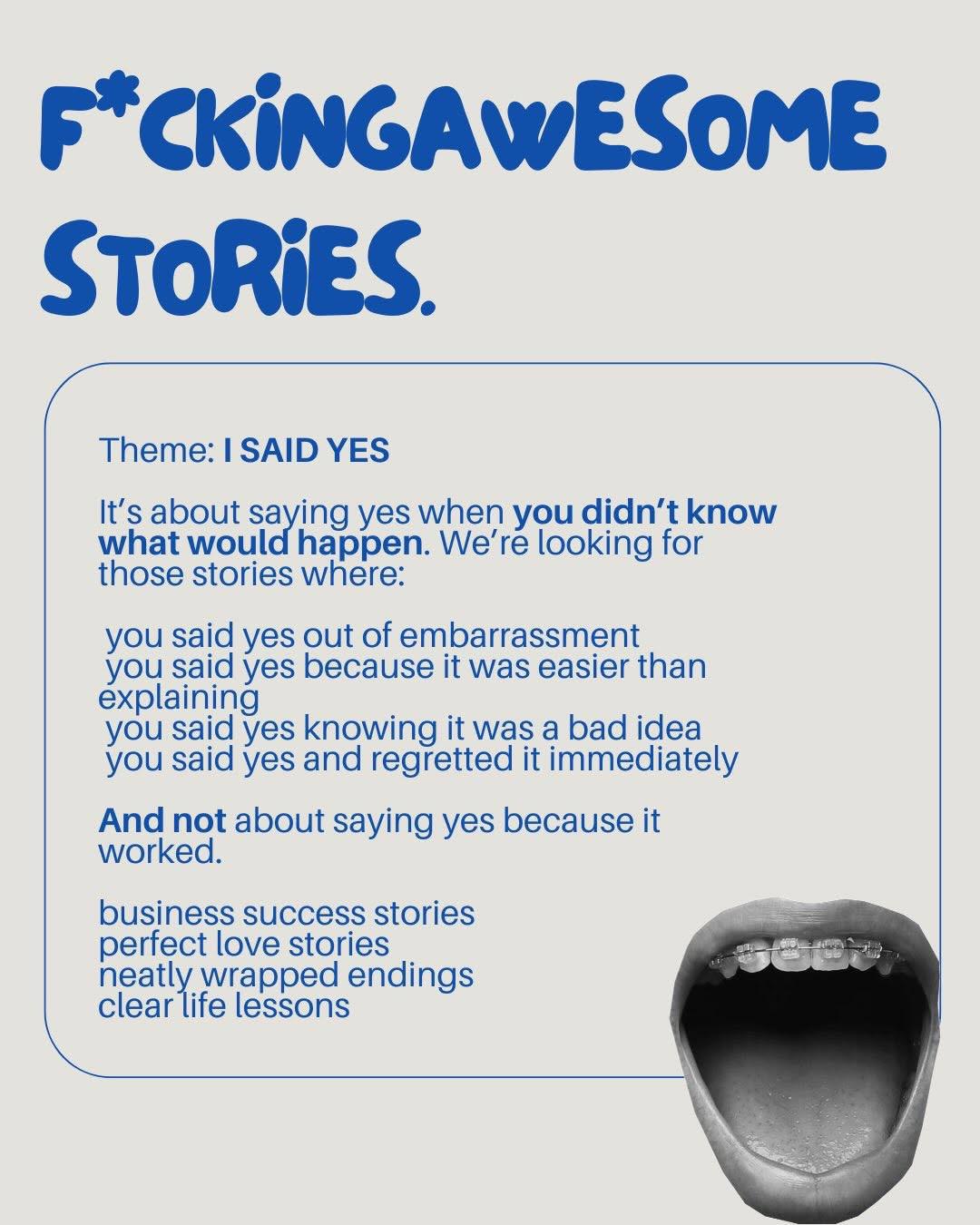 Each edition of F*ckingAwesomeStories has a specific theme that your story has to relate to (how/in what way is up to how you interpret the theme - you can be VERY creative). Double check you can make it on the scheduled date/time before signing up.